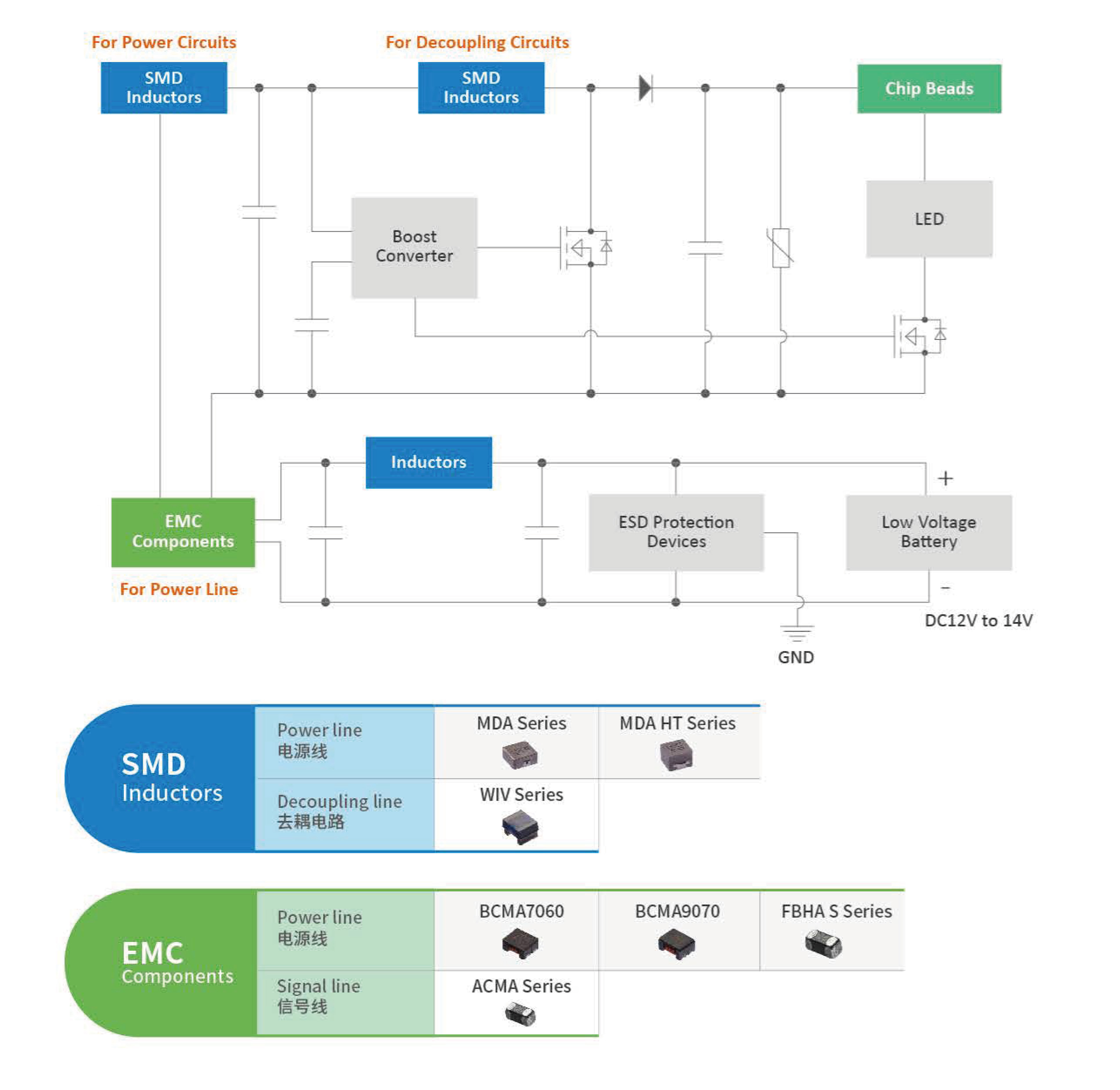 在車(chē)燈照明系統(tǒng)中,科或提供的電感產(chǎn)品具備高飽和電流、低損耗和優(yōu)異的電磁轉(zhuǎn)換效率,能夠穩(wěn)定支持LED驅(qū)動(dòng)模塊在各種復(fù)雜工況下的可靠供電,確保車(chē)燈在啟停響應(yīng)、亮度控制、動(dòng)態(tài)調(diào)光等功能中始終保持精準(zhǔn)表現(xiàn)。同時(shí),其良好的EMI性能也有助于整車(chē)通過(guò)電磁兼容測(cè)試,滿(mǎn)足車(chē)規(guī)標(biāo)準(zhǔn)。