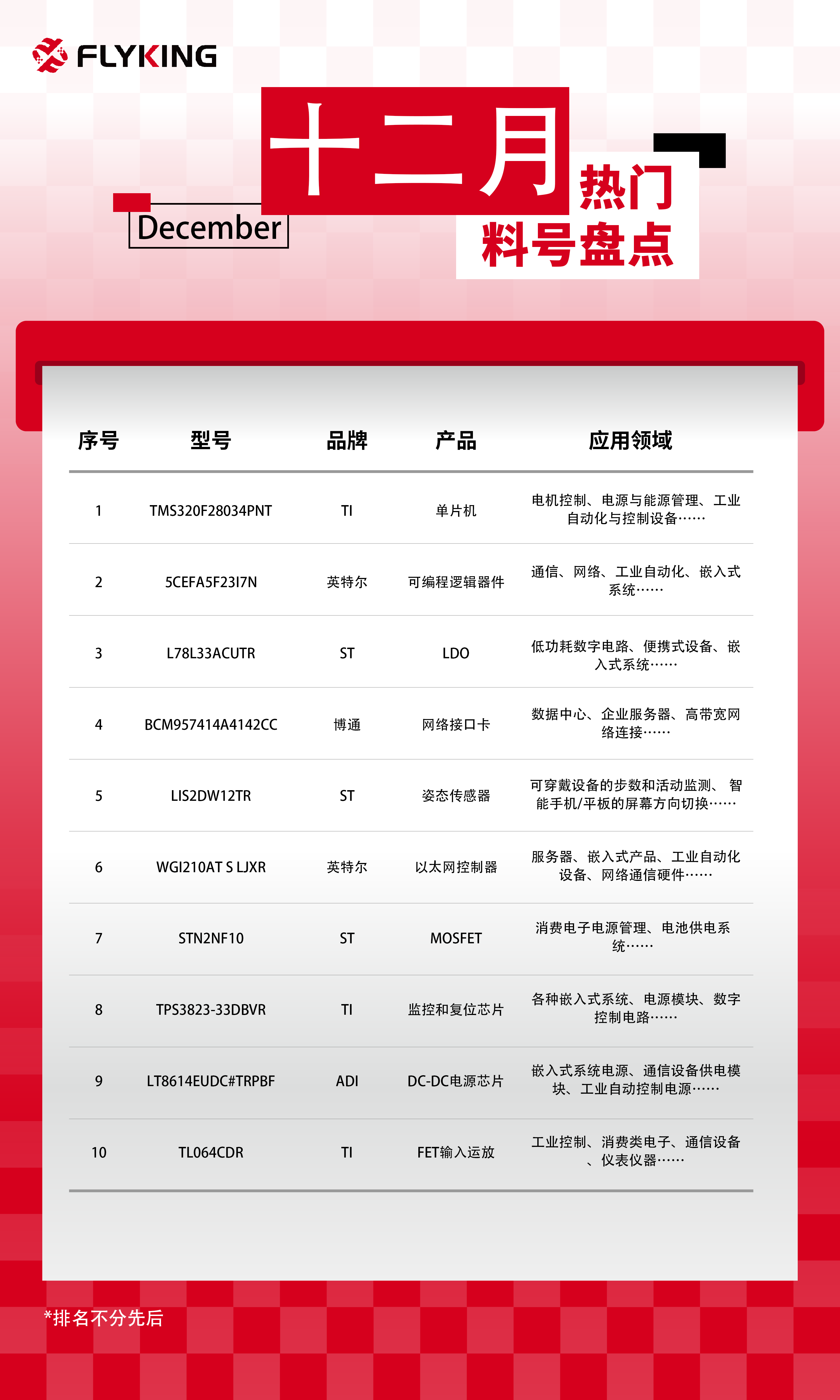 基于對市場的持續(xù)跟蹤,我們從客戶咨詢頻次、市場熱度以及行業(yè)應(yīng)用廣度出發(fā),對近期關(guān)注度較高的產(chǎn)品進行了系統(tǒng)梳理,整理出2025年12月市場熱度較高的十大熱門料號。這些器件覆蓋工業(yè)控制、通信網(wǎng)絡(luò)、電源管理、傳感與計算等多個核心應(yīng)用方向,在一定程度上反映了當(dāng)前下游需求結(jié)構(gòu)與工程端選型趨勢。