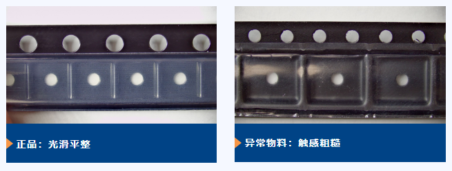 6、編帶造假一些貼片類(lèi)元器件需要編帶包裝,不良商家會(huì)將翻新后的元器件重新編帶,模擬正品的包裝形式,但造假的編帶在材質(zhì)、尺寸、間距等方面可能與正品存在差異,而且元器件在編帶中的固定也有可能不夠牢固。