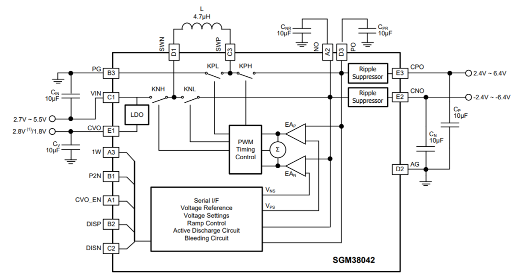 圣邦微推出的SGM38045芯片,包括一個1×/1.5×電荷泵和 一個-1×反向電荷泵,由2.7V~4.8V輸入電壓生成所需的三個電源軌輸出: