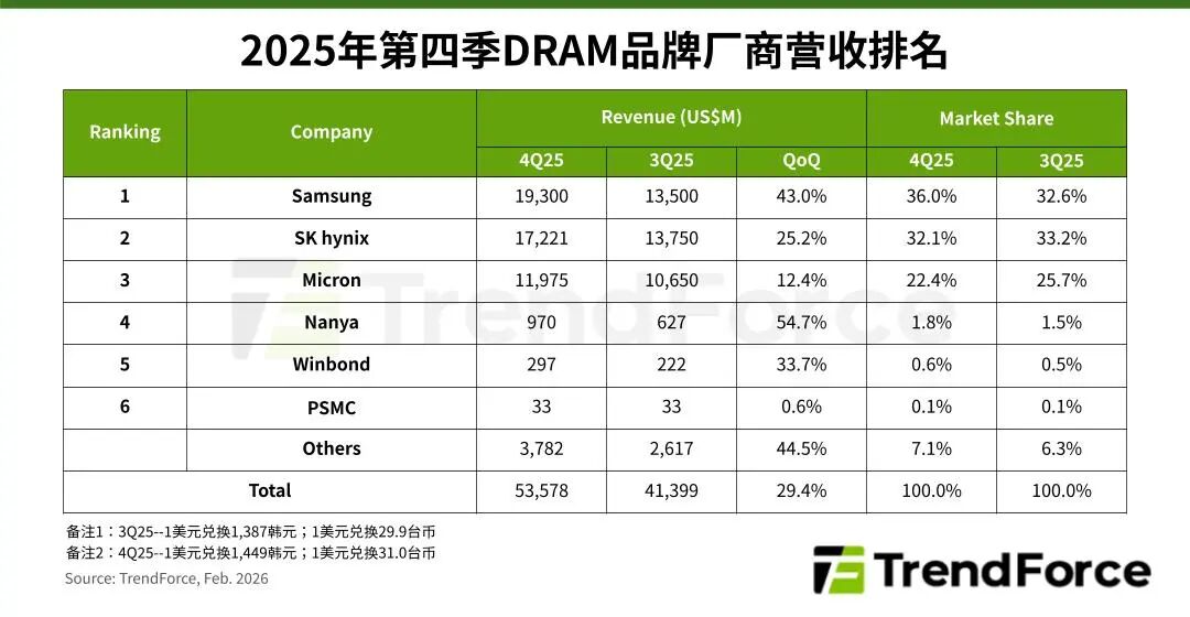 從各大供應(yīng)商營(yíng)收來(lái)看,2025年第四季度三星營(yíng)收增至193.0億美元,環(huán)比大增43.0%,市場(chǎng)份額回升3.4個(gè)百分點(diǎn)至36.0%,重返行業(yè)第一。SK海力士營(yíng)收增至172.2億美元,環(huán)比增長(zhǎng)25.2%,市場(chǎng)份額下滑1.1個(gè)百分點(diǎn)至32.1%,排名降至第二。美光科技營(yíng)收增至119.8億美元,環(huán)比增長(zhǎng)12.4%,市場(chǎng)份額下滑3.3個(gè)百分點(diǎn)至22.4%,排名第三。