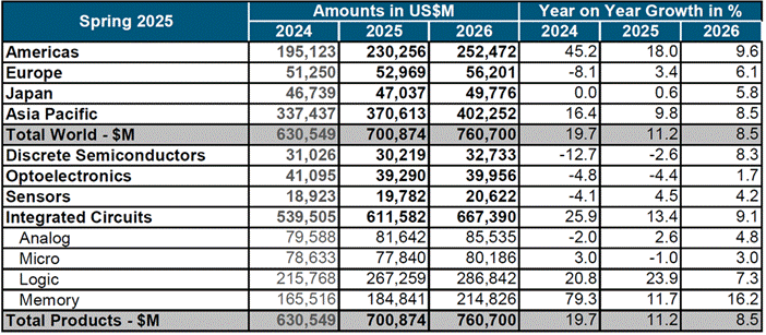 WSTS指出,繼2024年強勁反彈之后,預計2025年全球半導體市場將增長11.2%,總價值將達到7009億美元。這印證了WSTS對行業(yè)持續(xù)增長的預期。此次擴張主要得益于邏輯和存儲器領域持續(xù)強勁的勢頭,預計這兩個領域都將實現(xiàn)強勁的兩位數增長,這得益于人工智能、云基礎設施和先進消費電子等領域的持續(xù)需求。此外,傳感器和模擬等細分領域預計將做出積極貢獻,盡管增長較為溫和。